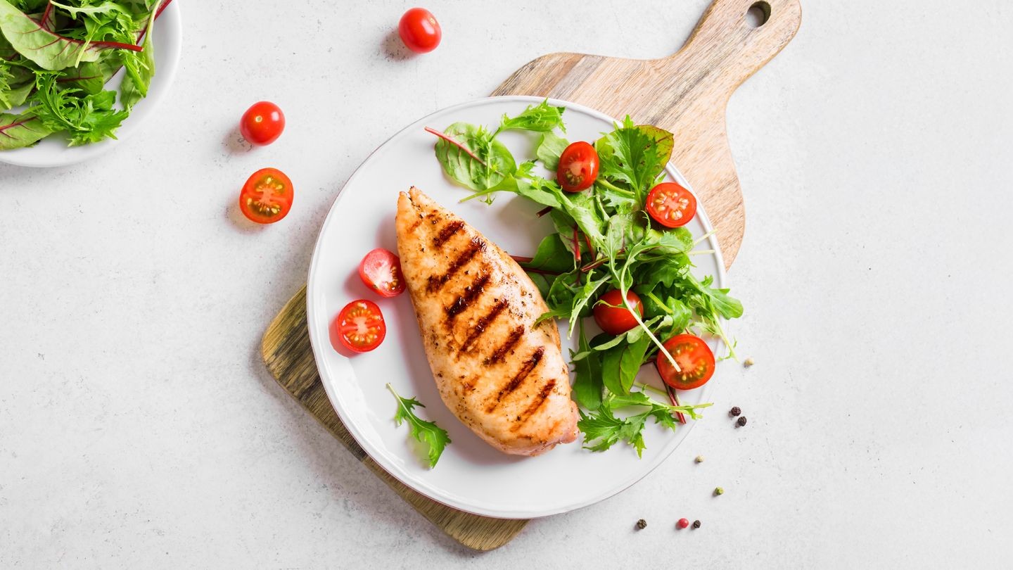 Zasada 1/4-1/4-1/2: Wypełnij połowę talerza owocami i warzywami, jedną czwartą pełnymi ziarnami, a pozostałą ćwiartkę chudym białkiem.